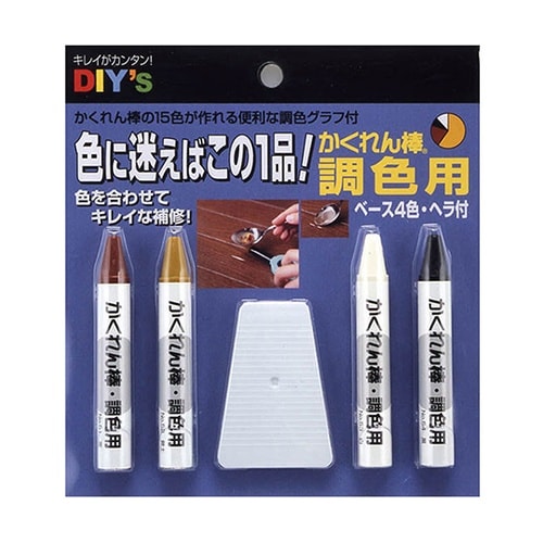 フローリングや木製品の補修に最適!キリキズに直接スり込めるソフトタイプ。簡単に調色ができる便利な4本セット!4色で調色することであらゆる茶系の色を作ることができます。 |