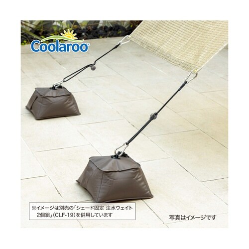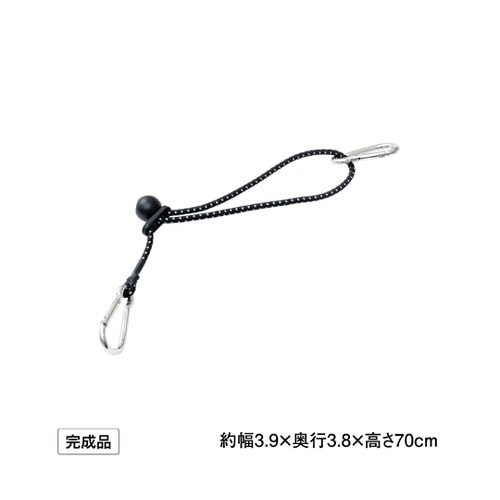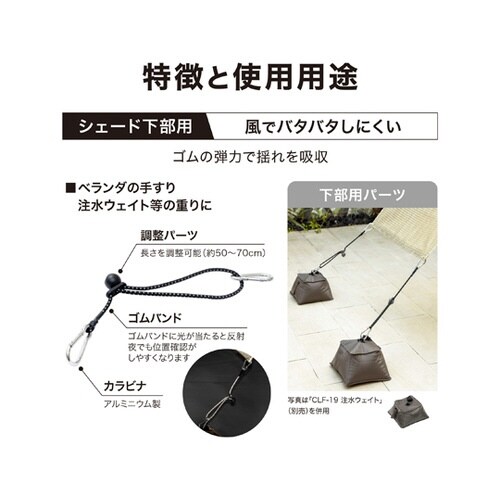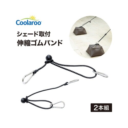 すだれやシェードの取り付け金具(下部用パーツ)。シェードの下部に取付けるカラビナ付きの伸縮ゴムバンドです。注水ウェイト(別売)・ベランダの手すり・デッキの手すり・フック付ウェイトなどに固定します。 |