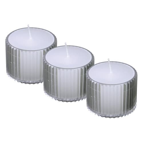 クリアカップ入りで明るく、3個入りはお徳です。マッチ付の安全ローソクと組でお求め下さい。 |