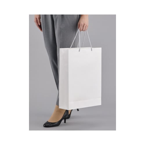表面がポリエチレンでラミネートされているので雨などの水濡れに強い紙手提げ袋です。お客様へのお渡しや営業の持ち運びなどシーン問わず使いやすいシンプルな白無地デザインです。 |