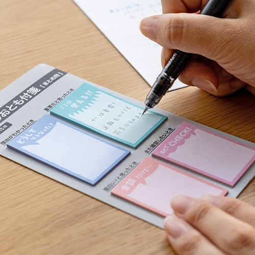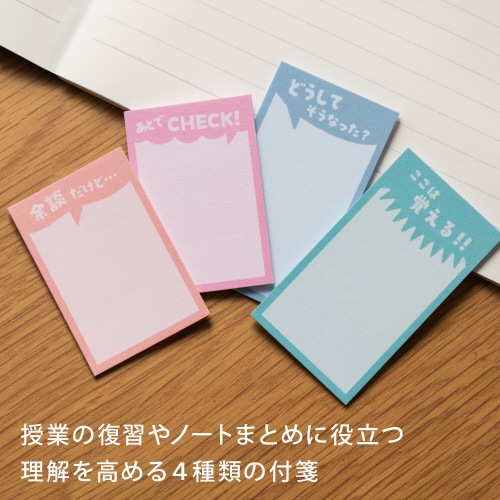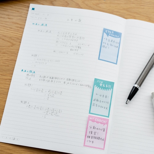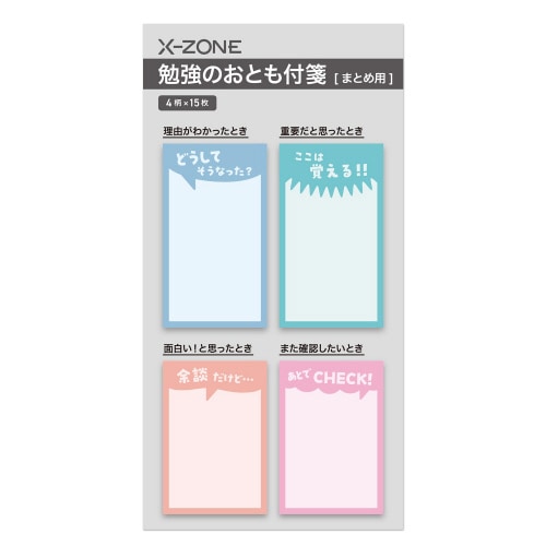 X−ZONEシリーズは「ノートは書いた後に活用する」をコンセプトに、今回は復習に着目したオリジナル罫線と付箋を開発しました。付箋・演習用はセンターライン罫と合わせて使うことで効率アップ。