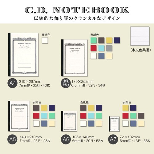 懐かしさの中に新しさがあるロングセラーノート。色鮮やかなカラー表紙。伝統的な飾り罫の復古調デザイン。