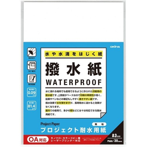 水や水滴をはじくOA対応用紙。撥水効果で水を弾き、屋外での使用に最適です。 |