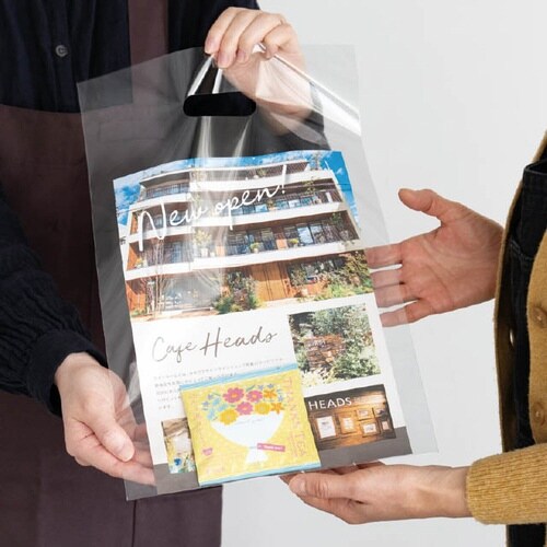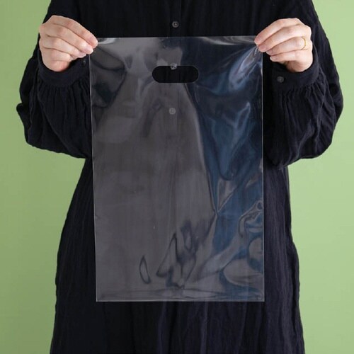リーズナブルな透明無地のOPP袋。試供品配布や大量配布に最適で、ハンドル付きで持ち運びも便利です。 |