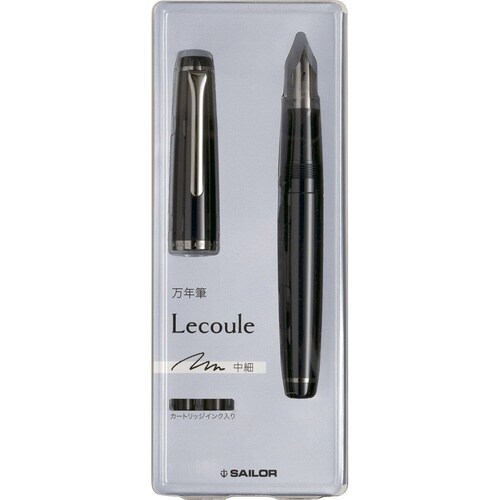 金属パーツがクールな雰囲気を醸し出す、ダークカラーのボディの万年筆です。中細のペン先なので、はじめての万年筆にも書きやすい太さ。
