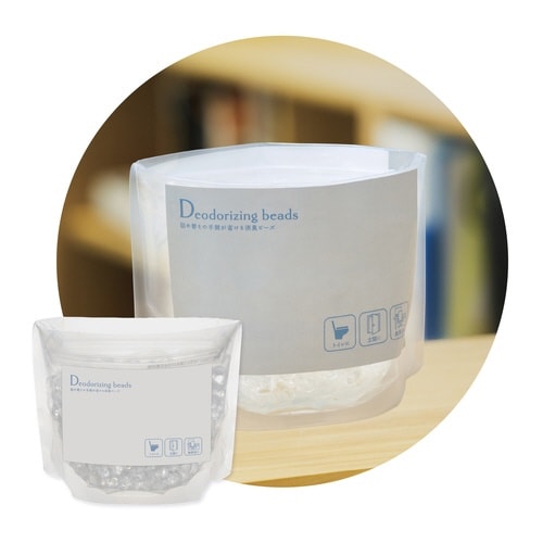 袋のまま置ける消臭ビーズ。ボトルにこびりついたビーズ掃除や詰め替えの手間を削減できます。水道水を入れて一晩待てばビーズが膨らみます。トイレや台所などの悪臭を消臭。厚み約1cmで保管でき省スペースに。 |