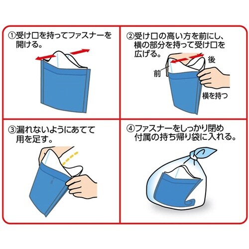 オシッコを素早く固めてニオイを包む、女性用携帯ミニトイレです。(小用)緊急時、尿凝固剤で素早く固めて処理できます。本体はファスナー付きなので使用後密封出来ます。 |