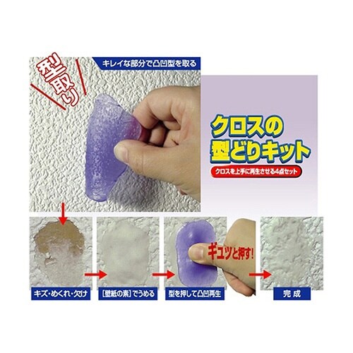 破れたり、キズついたりしたクロスにパテをうめ、型取り材を使って周囲と同じ凸凹を再現することができる破れたりキズついたクロスに、パテと型どり材を使って周囲と同じ凸凹を再現します。 |