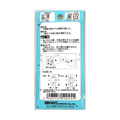 一動作で手軽に扉を開閉できる。木製扉(開き戸)の簡易戸締りに。取り付けの際、木部の割れやネジの破損を防ぐためキリで下穴を開けてください。 |