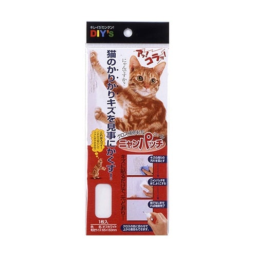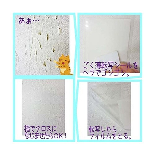 クロスにできたネコのひっかきキズを補修!極薄シートで貼り際に違和感がなくキレイです。お試しサイズ![こすって→はがす]の簡単作業で、猫がクロスや壁紙に作る削りキズ、めくれ等の補修ができます。 |