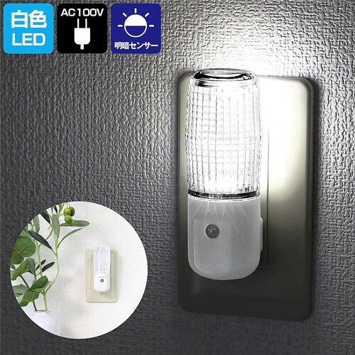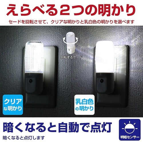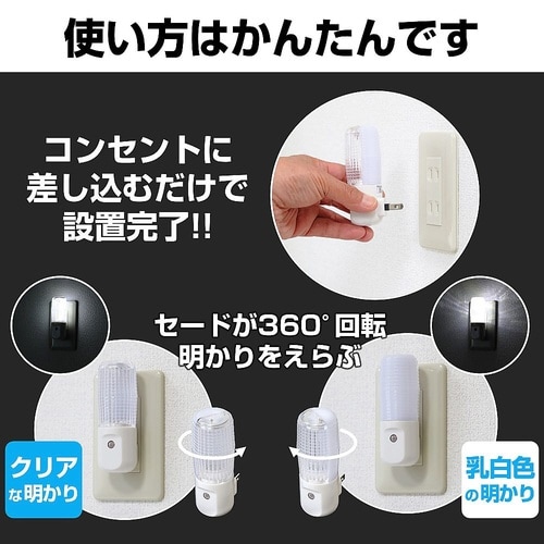 直接コンセントに差し込むだけですぐにご使用いただけます。暗くなると自動的に点灯し、明るくなると消灯します。セード(ライト部)が360°回転。クリア面と乳白色面の明かりが選べます。 |