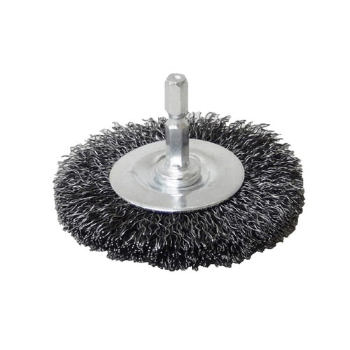 回転工具に取付けて研削、研磨するワイヤーブラシです。チャックがすべらない六角軸を採用。ペンキ剥がし、サビ取り、バリ取り等に使用します。