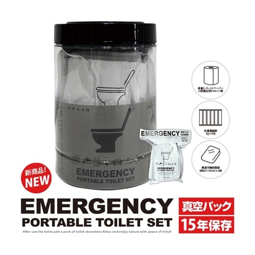 トイレットペーパー×1個の中に非常用トイレ6回分が入った真空パックの防災備蓄。水が使えない状況でも排泄袋に用をたして、凝固剤をふりかけるだけ。ジェル状に固まりゴミとして廃棄が可能です。 |