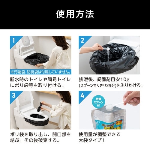 使用量が調整できる大袋タイプの非常用トイレ凝固剤です。凝固剤を振りかけると汚物を固めることができます。99%抗菌、臭い吸着&アンモニア99%消臭できて衛生的です。15年の長期保存可能です。 |