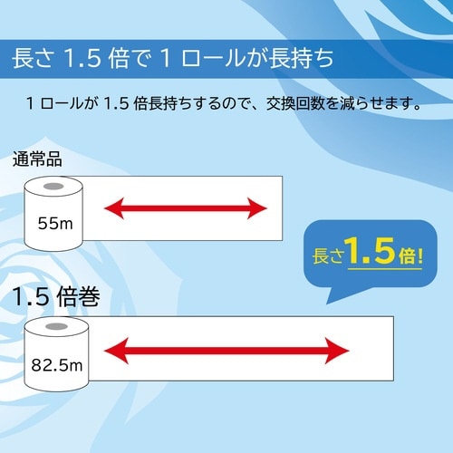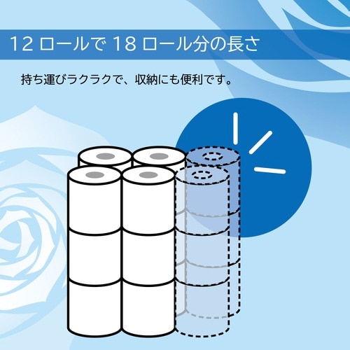 1.5倍巻で、12ロールなのに18ロール分の長さ。エンボス加工でふっくらやさしいソフトな肌触りと、ほんのりさわやかな花の香り。ピュアパルプ100%。 |