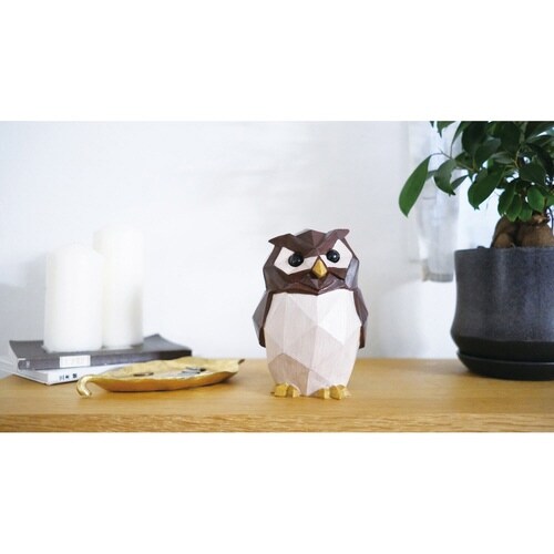 木彫り調のデザインがおしゃれな、樹脂製貯金箱です。 知性・勉学の象徴とされているフクロウがモチーフです。 木彫りのような質感や色味が表現された、ほっこりナチュラルな風合いです。 |