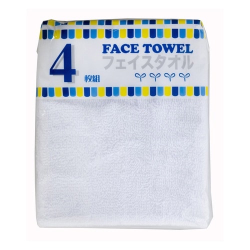 綿100%で吸水性がよく、ソフトな使い心地のフェイスタオルです。 4枚入りで、種類はアソート(ブルー、グリーン、ピンク、イエローが各2枚)と全色ホワイトがございます。 |