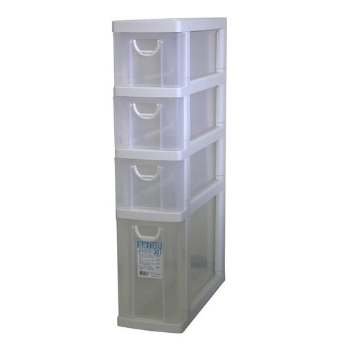 キッチンのちょっとしたすき間で使える、取っ手付きの引き出しタイプのスリムストッカー4段です。 幅19cmとスリムながら奥行きが47.5cmあるので収納力は抜群です。 |