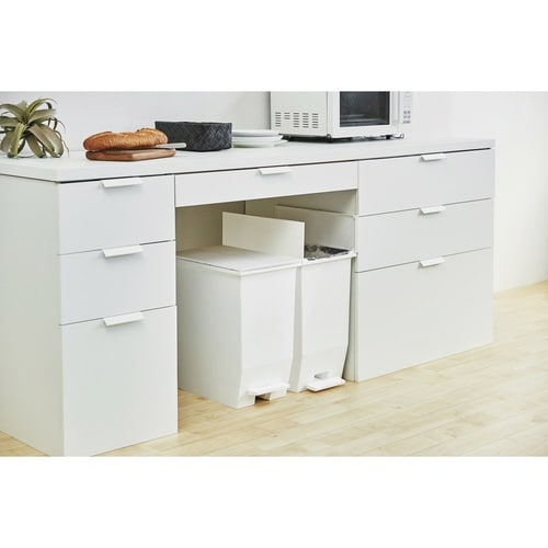 ふたが左右に分かれて両開きするので高さが限られた場所でもスッキリ収まるゴミ箱です。 ペダルが少し後ろについていて、狭い場所に置いても動線の邪魔になりません。 ふたを開けた状態のままで固定できます。 |