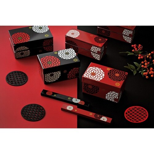 大きな花の模様が美しく、高級感のあるデザインのお重箱です。 運動会やピクニックにおすすめです。 黒と赤をベースに配色された、シンプルでモダンなデザインです。 持ち運びに便利なランチベルト付きです。 |