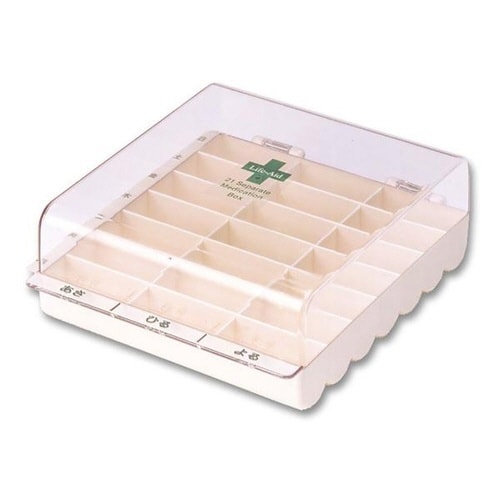1週間分のお薬を1日3回分に整理できるお薬ケースです。 一度に何種類ものお薬を服用される方におすすめです。 お薬の飲み忘れ防止になります。 小さなお薬も取り出しやすい丸み帯びた形状になっています。 |