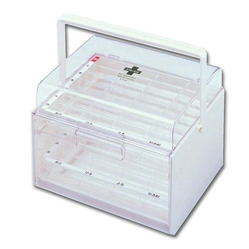 2週間分のお薬を1日4回分に整理できるお薬ケース トレーの入れ替えで1週間ごとに使える 小さなお薬も取り出しやすい 見やすい文字で迷わない 持ち運びに便利なハンドル付き |