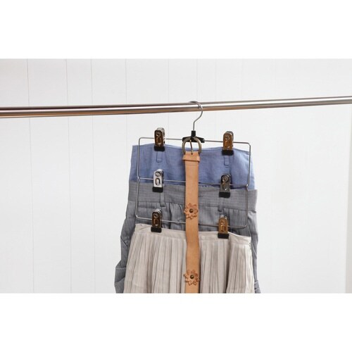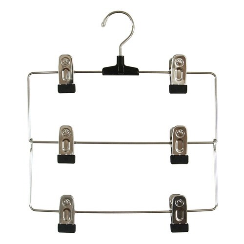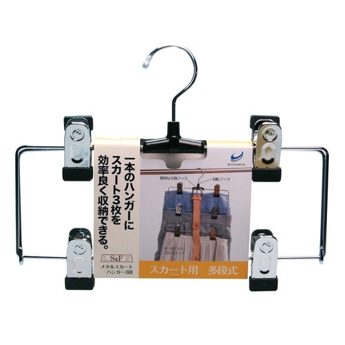 スカート3枚を効率よく収納することが出来るスカートハンガーです。 金属クリップがしっかりキャッチします。 回転フックなので便利です。 |