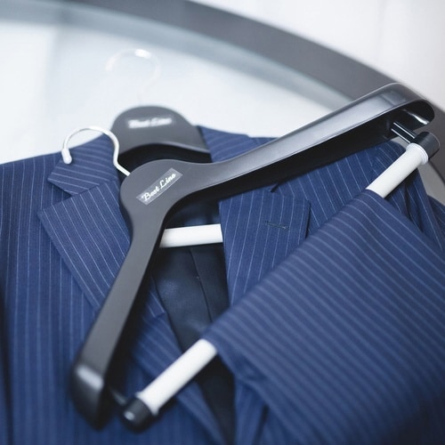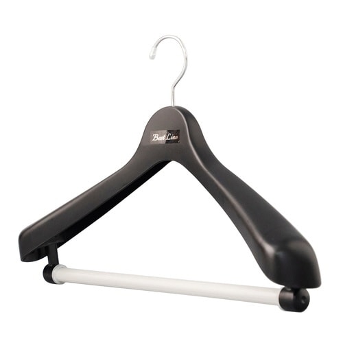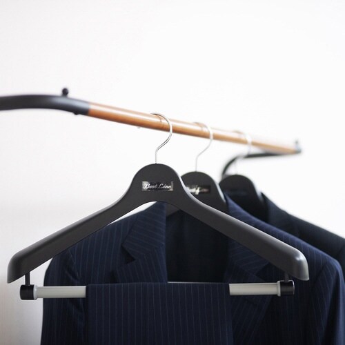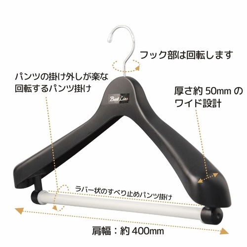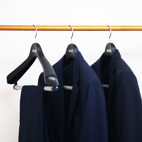 スーツの型崩れを防ぐハンガーです。 ハンガーの横幅が40cmなので、女性の衣類に適しています。 スラックスを掛けられるバーが付いているので、スーツを上下で掛けておけば、すっきり収納できます。 |