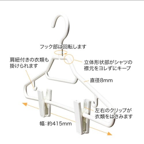 衣類が引き立つシャツハンガー 同色3本組 シャツの襟がよれない形状 シンプルが美しい「モノクローゼット」シリーズ 滑り止め付きクリップ 360度回転するフック |