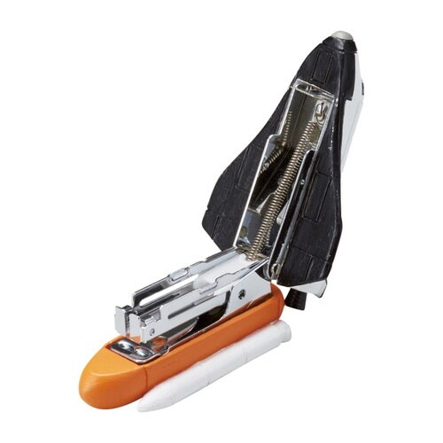スペースシップのロケット切り離しをイメージしたステープラーです。 リアルな仕上がりなので、置いておくだけで宇宙の世界観が広がります。 本体が大きく開くので針の補充がしやすいです。 |