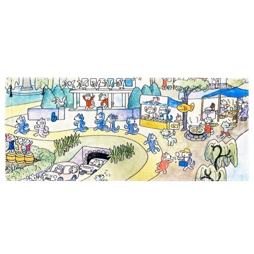 人気絵本「11ぴきのねこマラソン大会」のデザインのフェイスタオルです。 絵本の細かい絵柄がきれいにプリントされています。 綿素材のシャーリング生地で柔らかくすべすべした肌触りが特徴です。 |