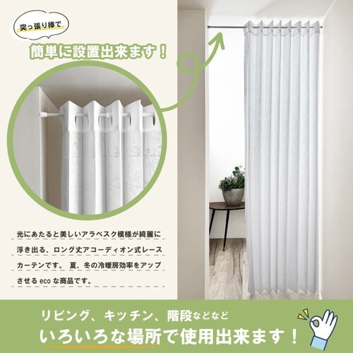 アラベスク柄のアコーディオンカーテンです。150×250cm コンパクトに折りたためます。 長さ調整が可能です。 しっかりした生地感です。 突っ張り棒で簡単設置できます。 |
