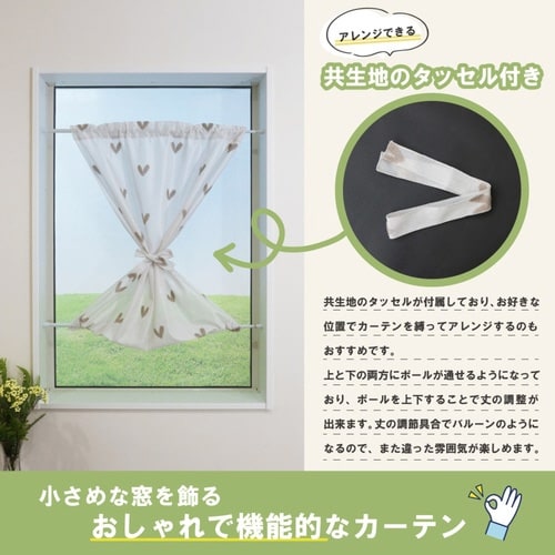 ハート柄がアクセントの小窓カーテンです。 断熱・保温・UVカット・ミラー効果・ウォッシャブルと機能性にも優れています。 程よい透け感で光を通し、お部屋の明るさを保ちます。 |