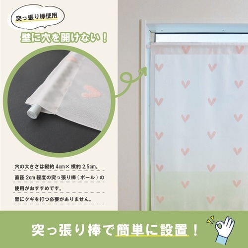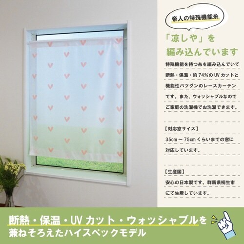 ハート柄がアクセントの小窓カーテンです。 断熱・保温・UVカット・ミラー効果・ウォッシャブルと機能性にも優れています。 程よい透け感で光を通し、お部屋の明るさを保ちます。 |