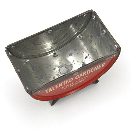 可愛らしい半円型は、缶詰の空き缶をリサイクルしています。 小さいながらもペイントの剥がれなどによるアンティーク風加工もしっかり施しており、緑に映える鮮明なレッドカラーと相まって存在感は抜群です。 |