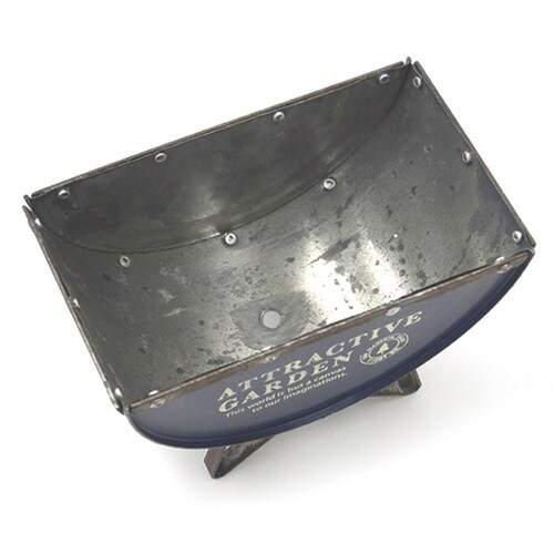 可愛らしい半円型は、缶詰の空き缶をリサイクルしています。 小さいながらもペイントの剥がれなどによるアンティーク風加工もしっかり施しており、緑に映える落ち着いたブルーと相まって存在感は抜群です。 |