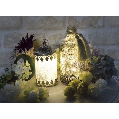 ドレッシーな飾りを施したLEDランタンです。 モノトーンのインテリアにも合うシックなデザインです。 リラックスタイムを優雅に演出してくれます。 点灯時は淡い色合いのガラスがやさしく煌めきます。 |