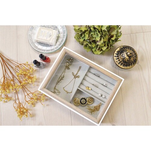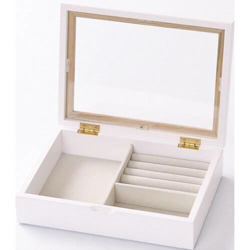 天然木とホワイトの組み合わせが上品なジュエリーボックスです。 大小サイズ違いのフリースペースで自分好みに使用出来ます。 リングピローを広く設計しており、リングやピアスをたくさん収納出来ます。 |