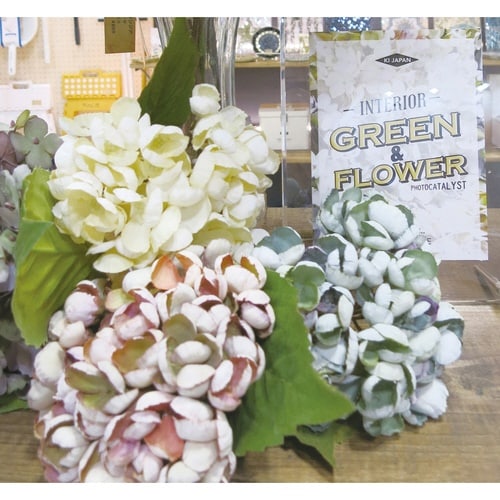 フェイクグリーンで作られたあじさいのブーケです。 飾るだけでお部屋がぱっと華やぎます。 光触媒による抗菌・消臭効果があります。 光触媒は太陽光や照明などによる化学反応で空気浄化を行います。 |