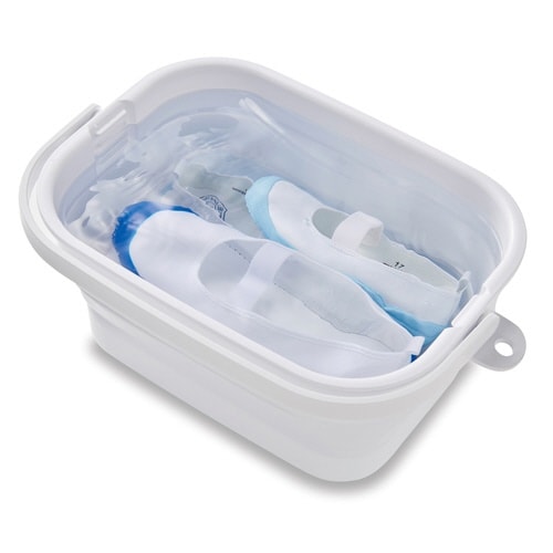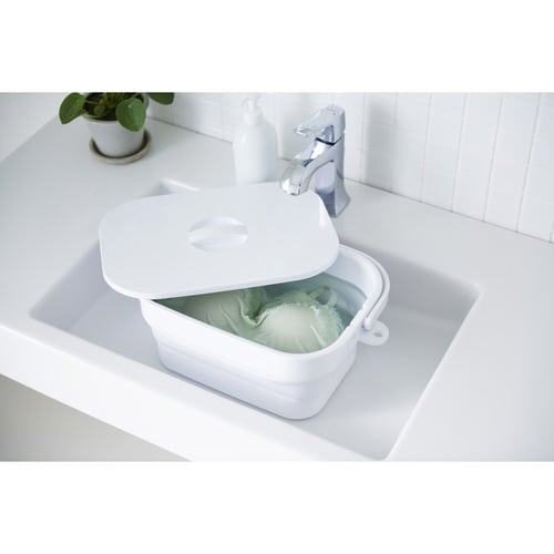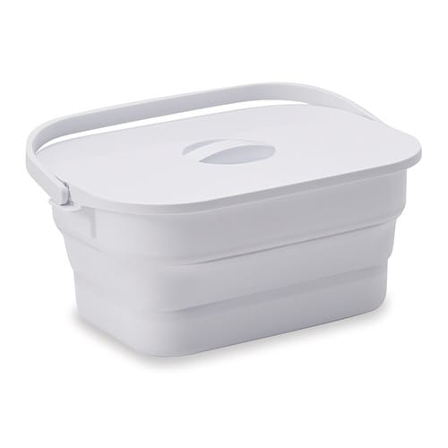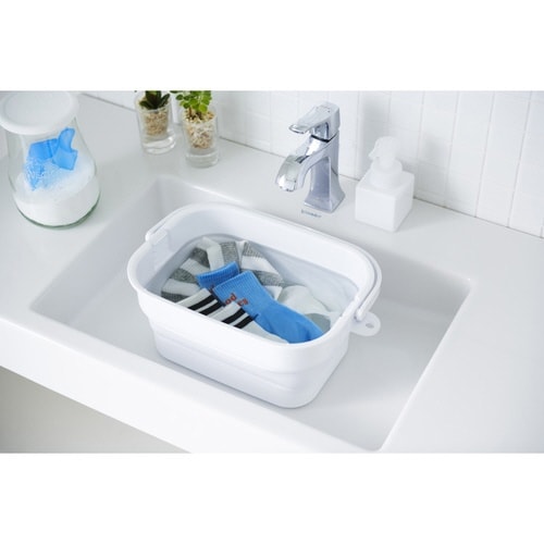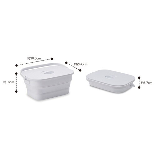 高さ調節可能な落し蓋で、つけ置き洗濯物の浮き上がりをガードします。 蓋付きで見せたくない物のつけ置きも安心です。 折りたたんで省スペースに収納できます。 持ち運びしやすいハンドル付きです。