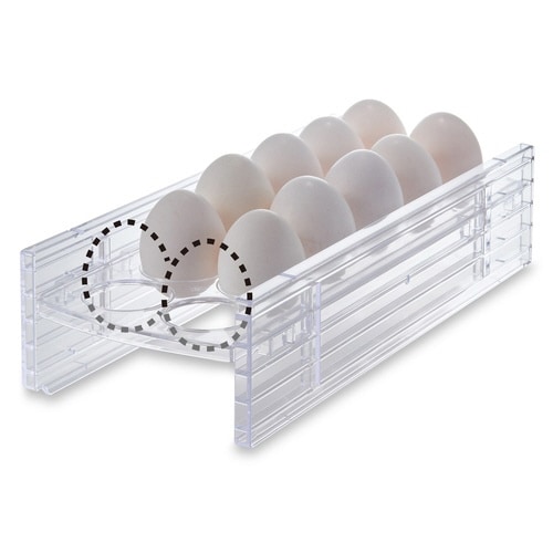 たまごを10個収納、プラス2個分のストックスペースがあるエッグラックです。 パックのままでも入ります。 下の空きスペースにもしっかり収納できます。 4段階の高さ調節ができます。 |