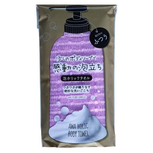 ポコポコとした凹凸感がお肌に心地よいボディタオルです。 ナイロン特有のシャリっとした程よい刺激で洗えます。 少量の石けんやボディソープでもたっぷりの泡が立ちます。 |
