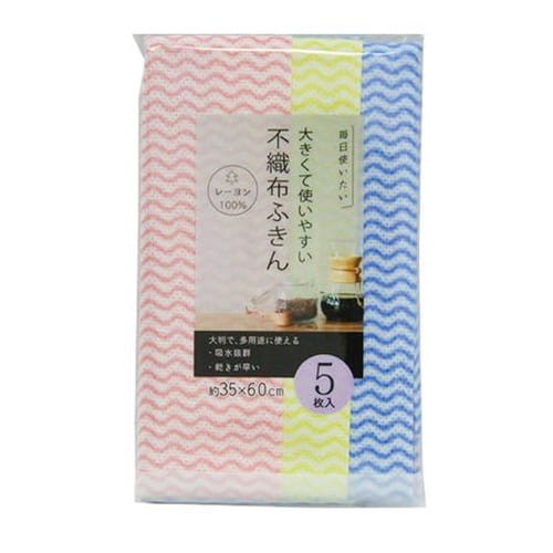 大判で多用途に使える不織布ふきん5枚入りです。 レーヨン素材なので、水・油汚れをサッと拭き取ります。 吸水性にすぐれており、繰り返し洗ってご使用できます。 |