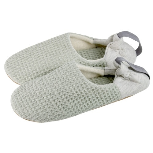 さらっとしたワッフル生地を使用した、靴のような感覚で履けるルームシューズです。 かかとのリボンを使うことでスムーズに履くことができます。 しっかりと甲を包み込んだデザインなので、脱げにくくて安心です。 |