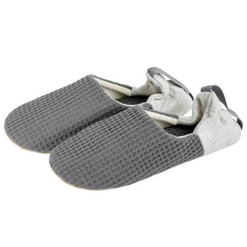 さらっとしたワッフル生地を使用した、靴のような感覚で履けるルームシューズです。 かかとのリボンを使うことでスムーズに履くことができます。 しっかりと甲を包み込んだデザインなので、脱げにくくて安心です。 |