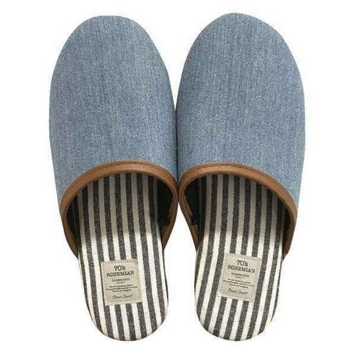 デニム生地とストライプの組み合わせがカジュアルでおしゃれなスリッパです。 底にポリエステルスエード生地を使用する事で足音を軽減します。 「70s BOHEMIAN」のシリーズのネームタグ付きです。 |