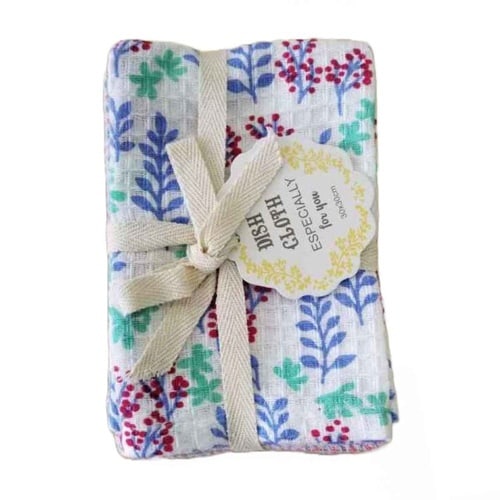 お皿やカップなどが拭きやすいサイズです。リーフ柄とチェック柄の2枚入です。コットンリボンでとめた可愛いラッピングでちょっとしたプレゼントにもおすすめです。