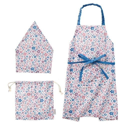 エプロン キッズ 3点セット 綿100% ポケット付き リサ 花柄 ブルー