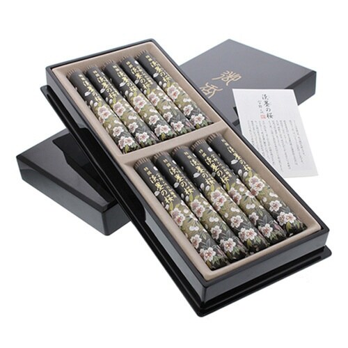 宇野千代が蘇生に尽力した「淡墨の桜」をイメージしたお線香です。 お線香は黒地に上品な桜の花をあしらった巻紙でお包みしています。 塗箱入りなので贈り物におすすめです。 |