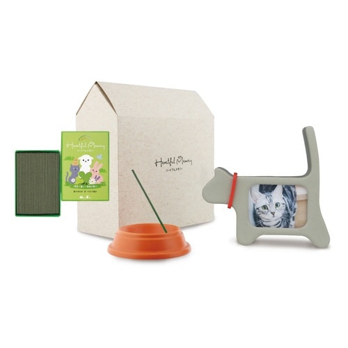 大切なペットのご供養のための「手元供養品」です。 わんちゃん・猫ちゃん型の写真立てが含まれています。 控えめな香りのお線香をエサ入れの形のお線香立てに挿してお供えください。 |